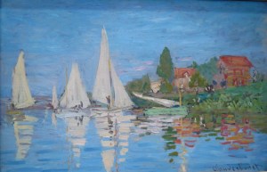 Hur som helst, väl inne på klubbhuset i Les Mureaux vid Seinens strand för att meddela klubbledningen vår pinsamma sorti ur dagens kappseglingar fick jag syn på fem målningar av klubbens berömde konstnär Claude Monet – samtliga föreställande segelbåter på Seine.