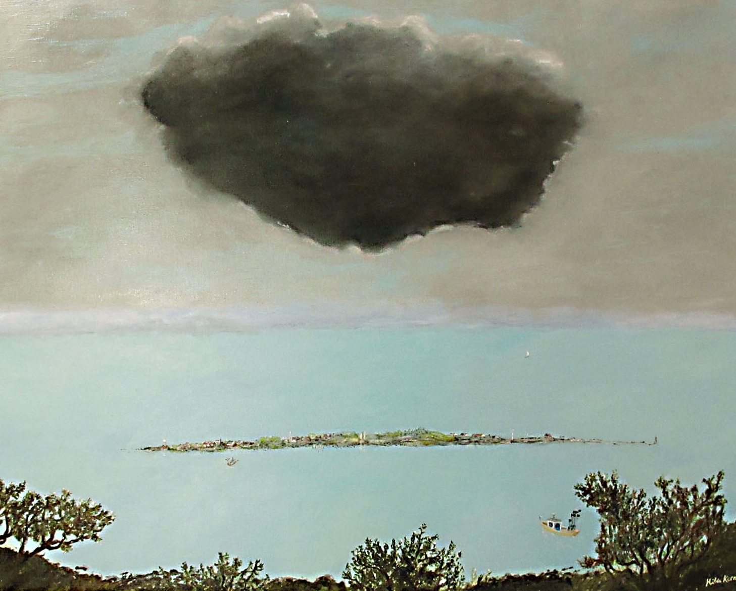 huvudet på konstnär och åskådare och påminner oss om livets mörkare sidor. Men lugn – det finns moln också på Hilda Kernells målningar – både ett svenskt åskmoln som svävar hotande över Visingsö i Vättern och ett holländsk moln som bildas av svart industrirök och som lägger städer och landskap i ett giftigt mörker. Det svenska molnets svarta innebörd är av privat men allmängiltig karaktär medan det holländska molnet är av global och symbolisk betydelse.