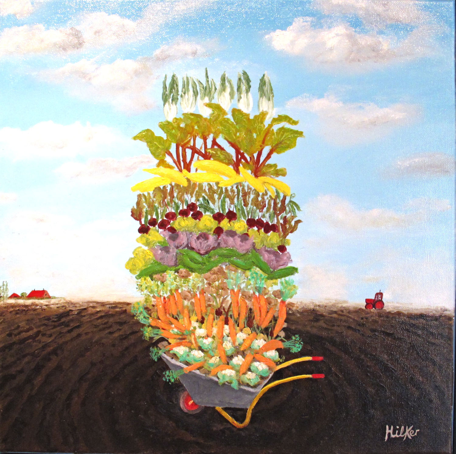 En ”Otroligt stor skörd” målad av Hilda Kernell som just nu ställer ut på Galleri Pictor tillsammans med keramikern Gertrud Oxenvad. Utställningen pågår till 4 augusti (därefter enligt överenskommelse)