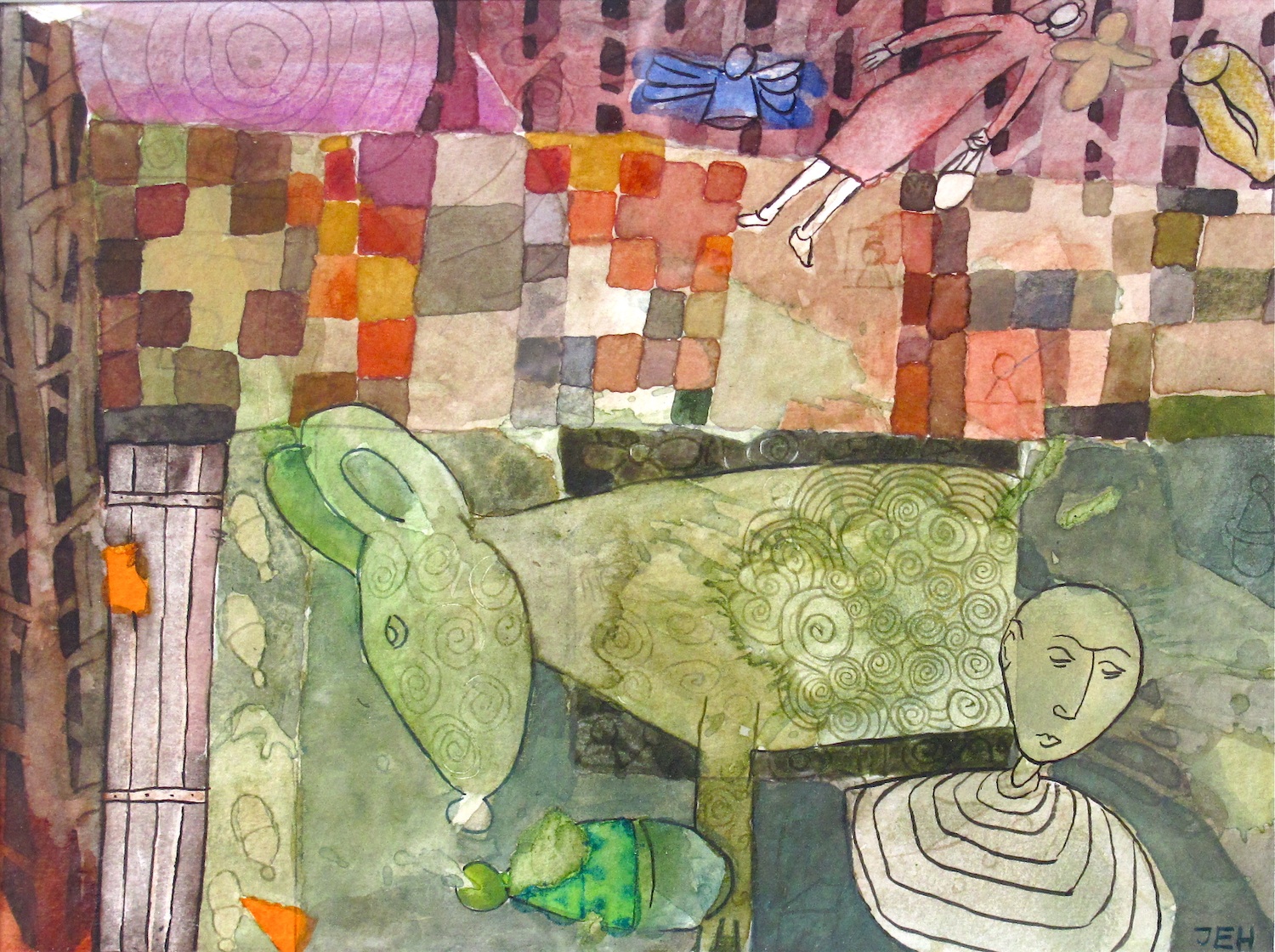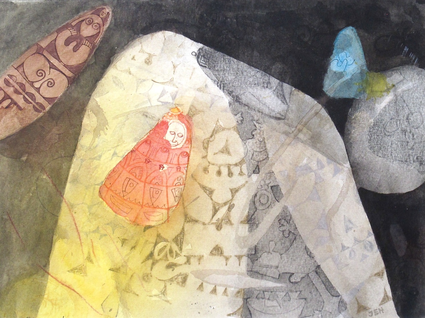 Tecken, figurer och kryptiska meddelanden från andra kulturer och andra tider – akvarellen ”Satellit” av Jan Erik Holst