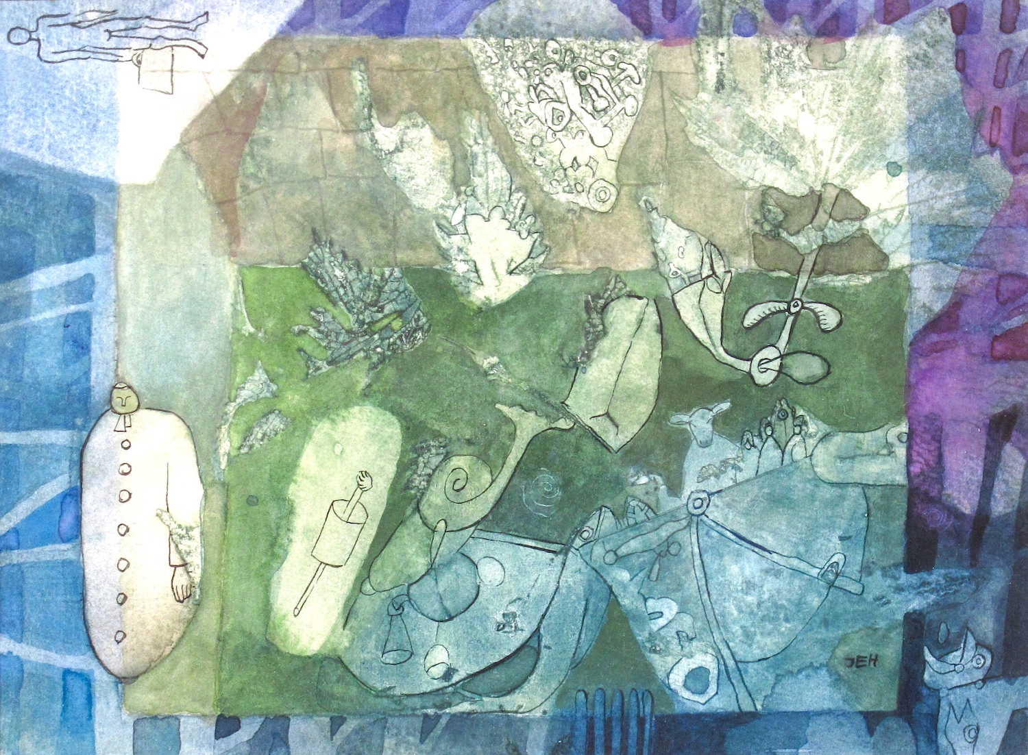 Bilderna skall andas, säger Jan Erik apropå bildernas täthet och akvarellernas till bredden fyllda  ytor med ornament, figurer och fält  i en kompakt stuvning. Men visst ”andas” bilderna. Det finns en kompositionell och ofta ganska intrikat uppdelning av akvarellernas ytor som trots att alla figurer, mönster och småformer ligger i samma plan, skapar ett sorts djup med flera lager i ett rum som låter bilden andas.  Det skenbara djupet skapas också i samspel mellan färgplan som går under, över  och i varandra.