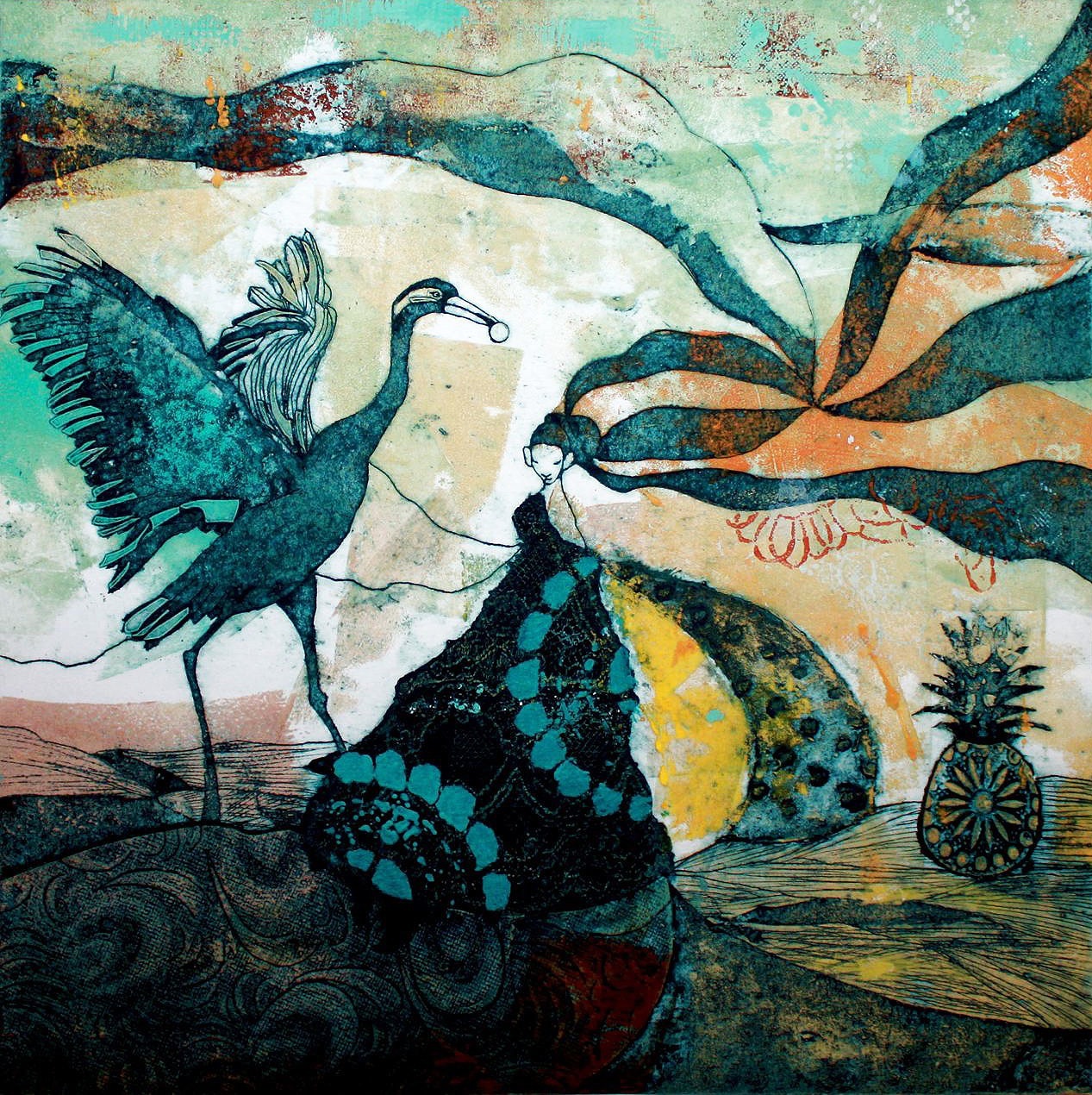 ”… med drag från japanska träsnitt och indiska miniatyrer” – ” Tranan” i blandteknik av Catharina Edlund som är Pictors sommarutställare 2014 tillsammans med Cecilia Kraitz, 29/6 – 20/7