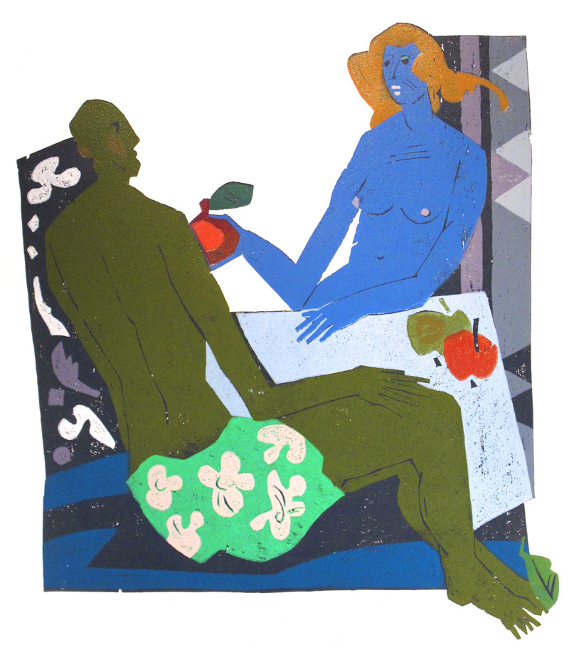 ”Der Apfel danach” (Äpplet efteråt) ett träsnitt av tyske konstnären Michael Hofmann från Dresden. Han visar ett tjugotal träsnitt på ”Vår på Pictor” 6/4 – 27/4 tillsammans med glas av Morgan Persson och ”porträtt” av Alain Soucasse
