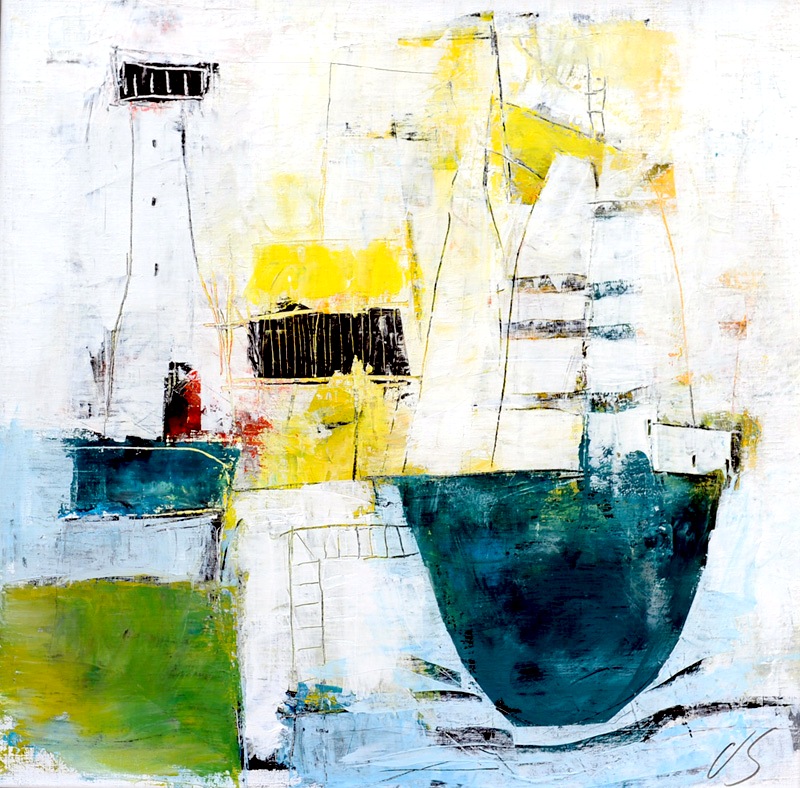Ullastina Larsson från Landskrona arbetar i en halvabstrakt stil som känns bekant, en stil som i själva verket hör till modernismens hörnpelare. Men hon har lyckats hitta något eget i denna väl kända stil. Hon målar ”cityscapes”, stadsbilder med huskroppar, fasader, byggnadsställningar, byggkranar och pågående byggarbeten på ett sätt så att man också tycker sig höra ljudet av pågående aktiviteter från ett stadslandskap i förändring. Det är hammarslag, betongbilars snurrande trummor, gnissel från byggkranar och skärljud från sågar och slipers.