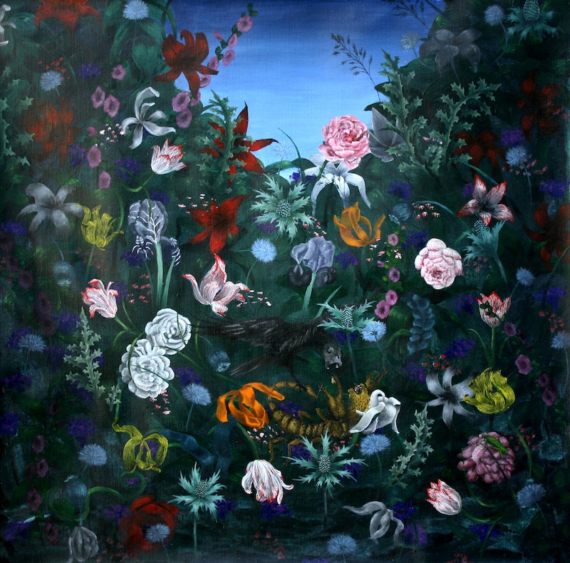 ”I blomsterprakten döljer sig sagans varg i en svart fågels skepnad…” målning av Clara Lundgren som ställer ut på Pictor 20/9 – 26/10 2014