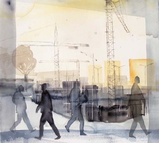 Byggarbetsplats, akvarell av Johan Ramberg som ställer ut tillsammans med glaskonstnären Betina Huber på Galleri Pictor 8/11 – 7/12 2014.
