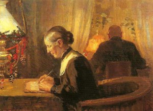 Dottern Helga Ancher (1883-1964) har här målat föräldrarna Anna och Michael när ”Julebrevene skrives” 1924