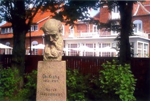 Krohg och krog – bakom porträttbysten av den norske konstnären Christian Krohg ses Brøndums värdshus som på flera sätt kom att spela en avgörandet roll för konstnärskolonin på Skagen.