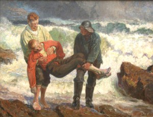 Målningar med mer dramatiskt innehåll  som ”Den druknede bringes i land” (178×233 cm) av Laurits Tuxen hör också till bilden av Skagenmåleriet. Målad 1913 och utställd på Salongen i Paris