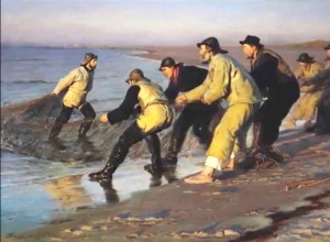 ”Fiskere trækker vod på Skagens Nordstrand. Sildig eftermiddag” – målning (135×190 cm)  av P S Krøyer 1883