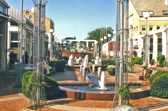 ”P Nørkjærs Plads” från andra hållet med Bjørn Nørgaards ”fontänallé” i mitten och tegelgaveln på Vendsyssels Kunstmuseum längst upp till vänster