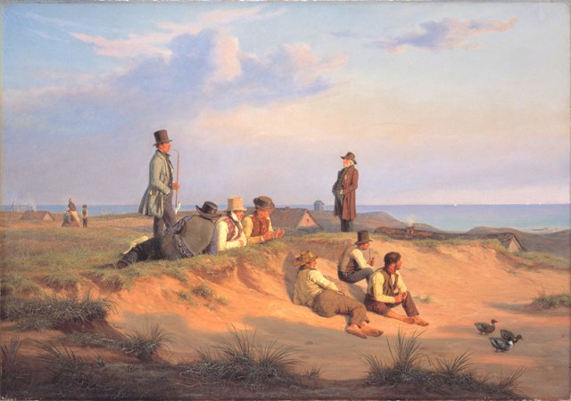 ”Prekolonial” målning från Skagen av Martinus Rørbye. Med bland annat denna målning, ”Mænd af Skagen en sommeraften i godt vejr”” från 1848,  gjorde den berömde ”guldåldermålaren” Martinus Rørbye Skagen känd för publik och konstnärer i Köpenhamn