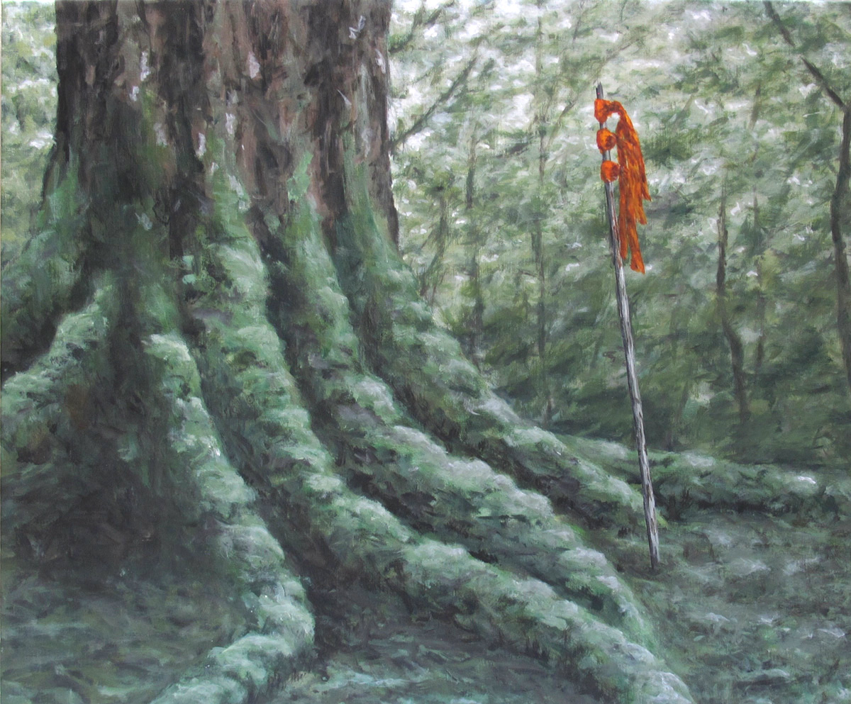 Det stora trädet – av flera tolkad som gran, tall eller redwood – är den del i målningen som klart och tydligt inte finns i målningen men som med bara ett enda undantag av alla tittare beskrevs som just ”det stora trädet”. Undantaget skrev ”nedre delen av en stam”. Det är just det man ser. Det är nödvändigtvis inte ens mer än bit stam av ett före detta, nersågat träd som man ser.