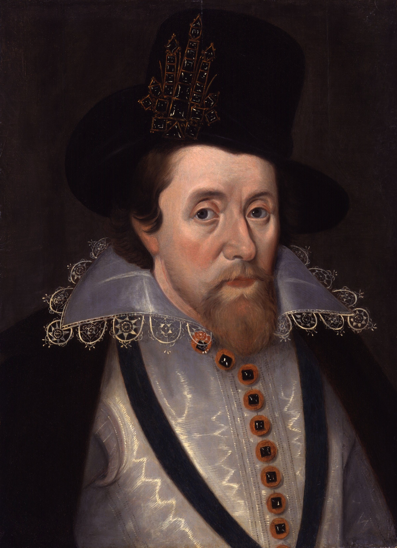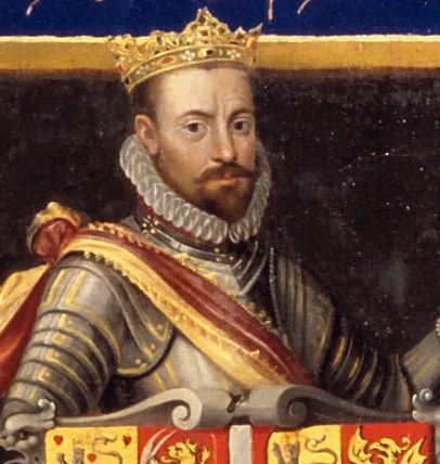 Först James VI av Skottland, från 1603 även James I av England, beskyddare av Shakespeare och ”The Globe” i London. Porträttet är målat av John De Critz d.ä.